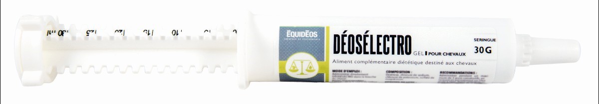 Déosélectro est un aliment complémentaire diététique sous forme de pâte ou de poudre assurant un apport en éléctrolytes au cheval :