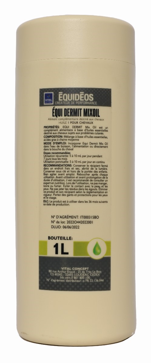 Équi Dermit Mixoil est un aliment complémentaire dédié aux chevaux sujets à la dermite estivale (démangeaisons) qui est une réaction cutanée à la piqûre des cullicoïdes. Les huiles essentielles contenues dans Équi Dermit Mixoil ont été soigneusement sélectionnées pour leurs vertus respectives et permettraient de soutenir le système immunitaire du cheval afin de diminuer sa réaction aux piqûres et les démangeaisons liées.